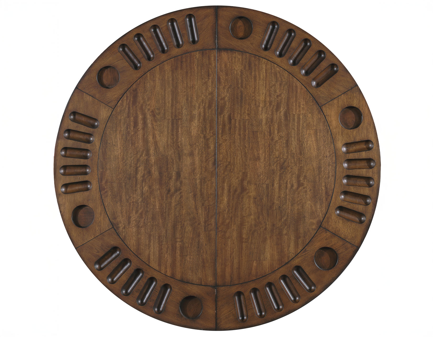 The Cambridge Game Top transforms the Cambridge Dining Table into the ultimate game night centerpiece. Designed with six individual playing stations, each featuring a built-in cupholder and five poker chip slots, it keeps every player organized and engaged. Expertly crafted from mango veneers and solid Asian hardwoods in a rich burnished chestnut finish, the top adds both function and beauty. When game time is over, the folding design allows for compact, easy storage—making it a stylish, space-saving solution for multifunctional dining and entertainment spaces.