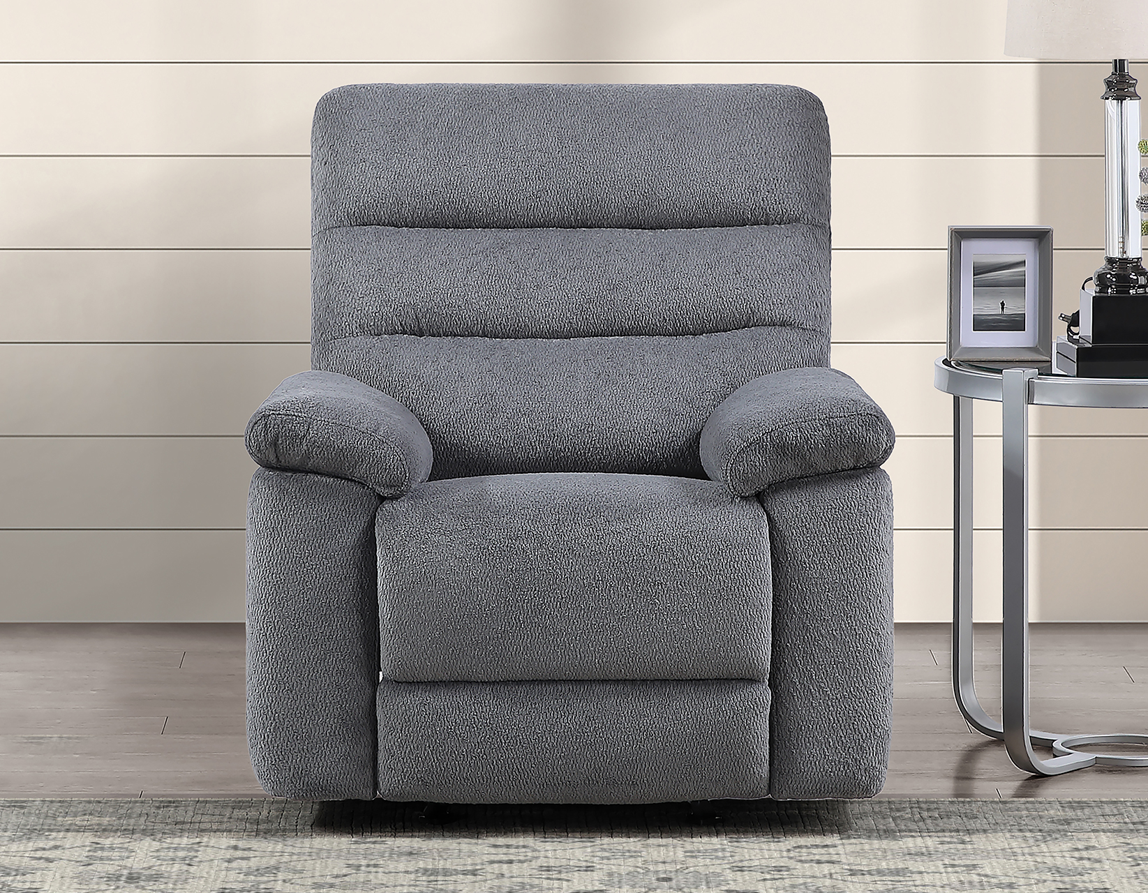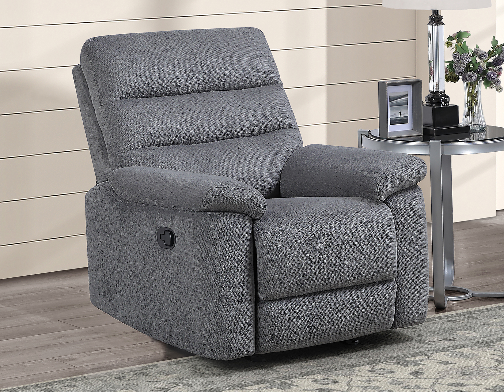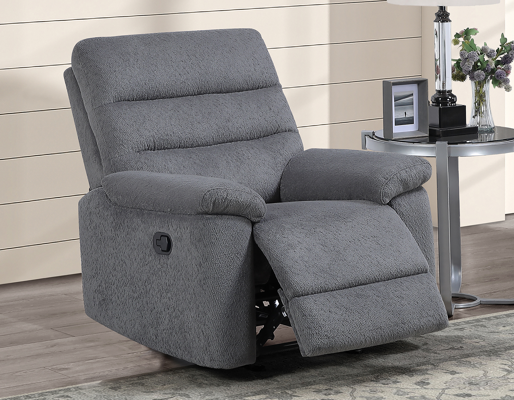 Sink into everyday comfort with the Cozy Manual Recliner. Upholstered in a stylish dolphin gray 100% polyester cover, it’s irresistibly soft to the touch while remaining stain-resistant and easy to care for. A plush, channeled back with 2.0-density foam delivers sink-in softness, complemented by generously overstuffed arms for added support. With an effortless pull of the side lever, the Cozy reclines smoothly into your ideal relaxation position—making it the perfect seat for unwinding anytime.