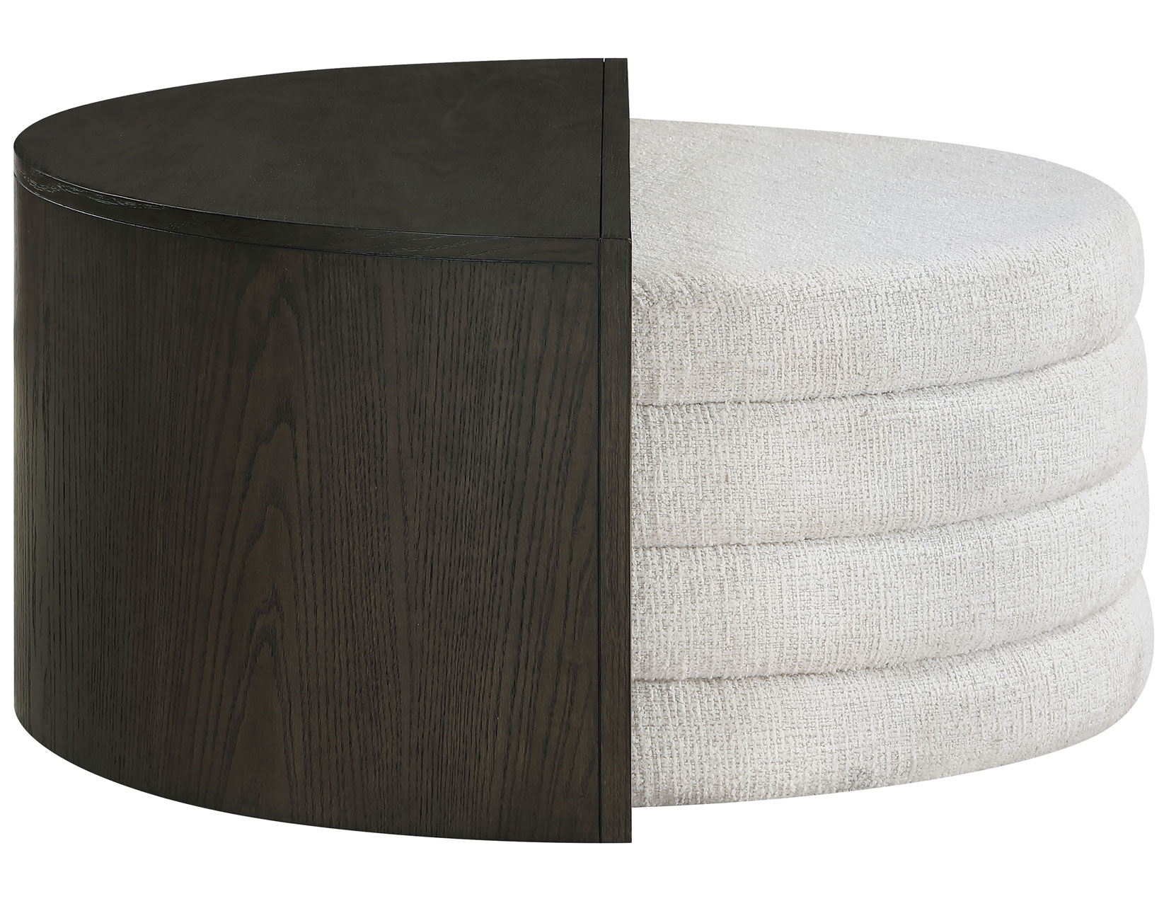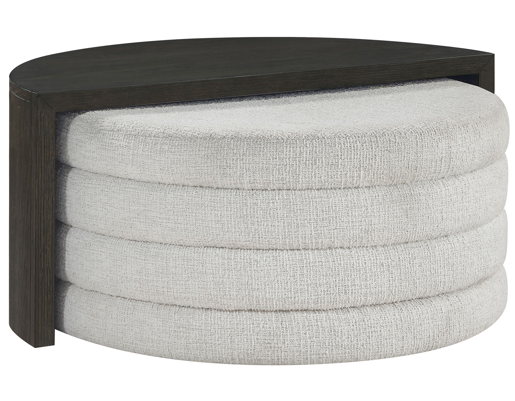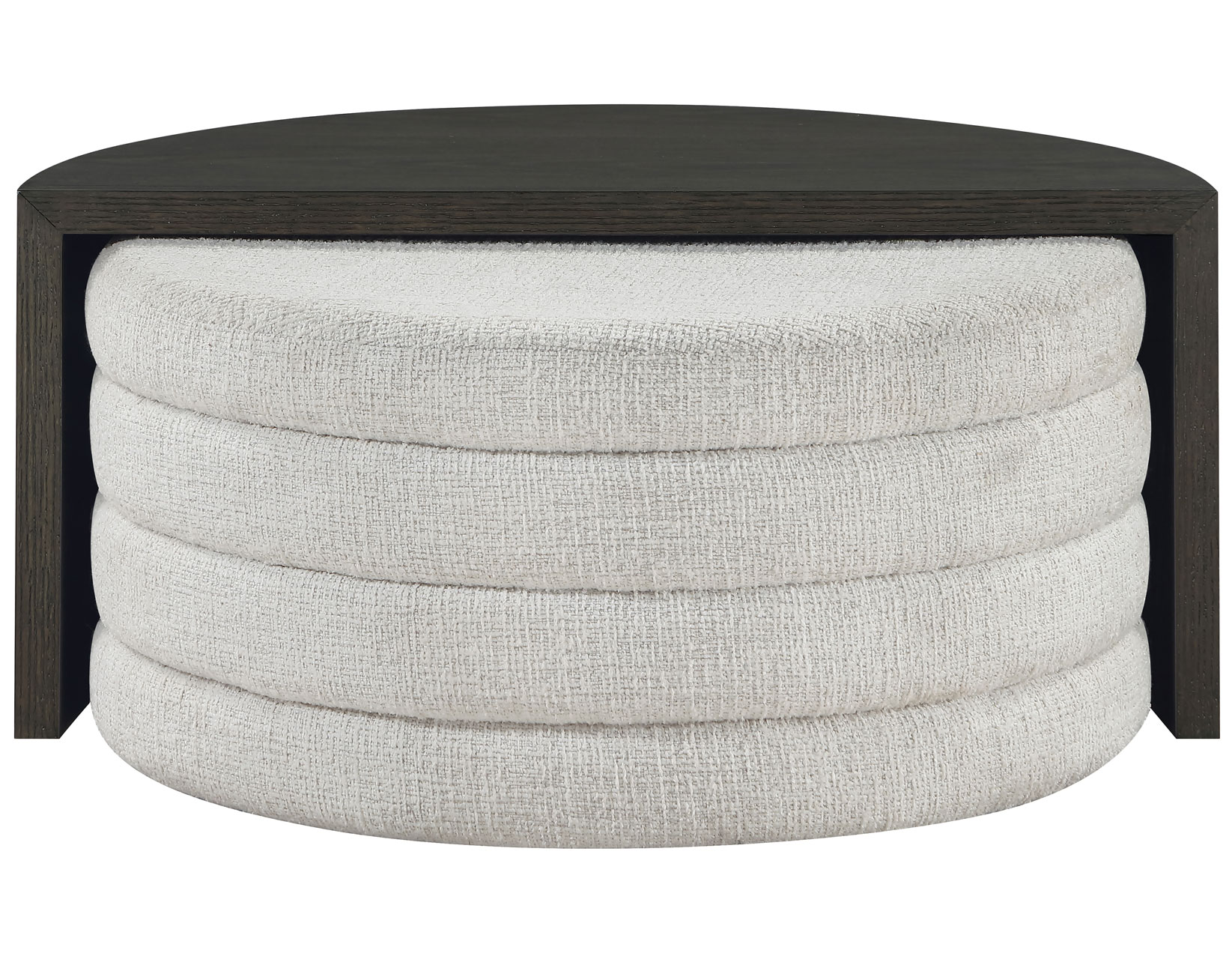 The Florence Cocktail Table with Nesting, Castered Ottoman blends smart design with effortless style. Finished in a rich black over oak veneers, the table adds depth and sophistication to any living space. The upholstered ottoman, in soft eggshell fabric with channeled sides, glides smoothly on casters and nests neatly beneath the table when not in use. Perfect for relaxing, entertaining, or offering extra seating, the Florence set delivers timeless appeal and versatile function in one elegant design.