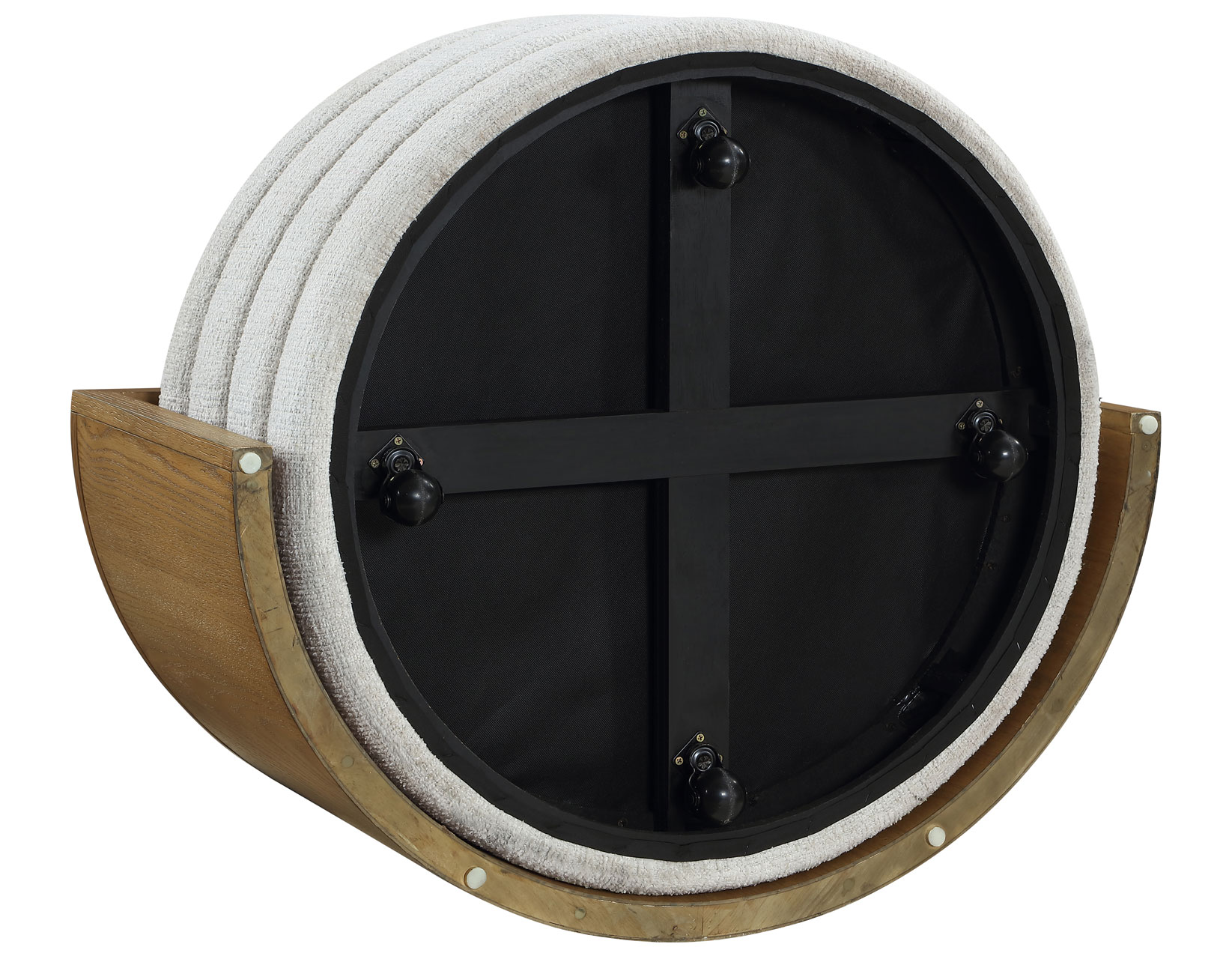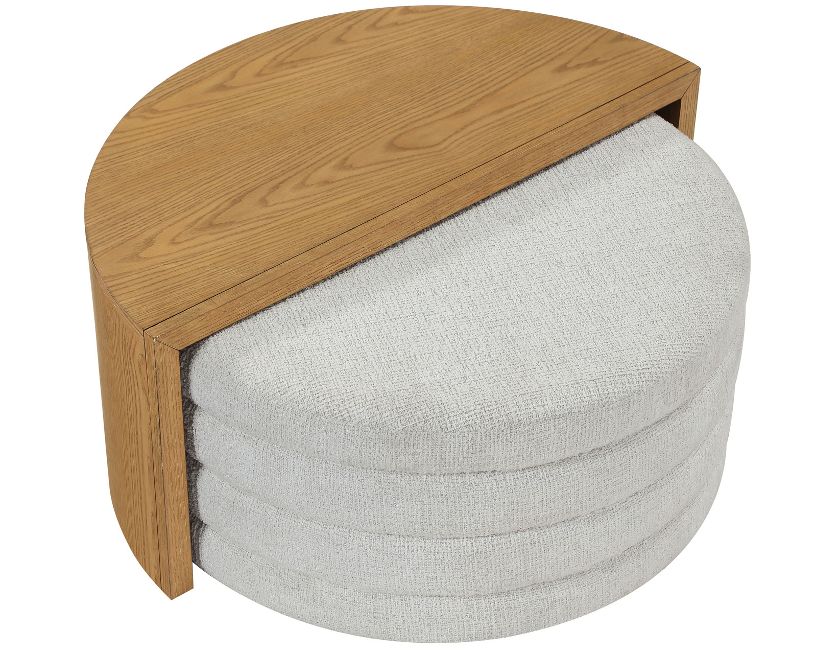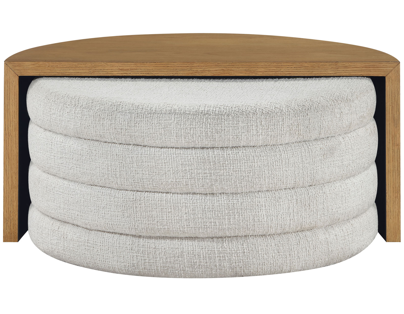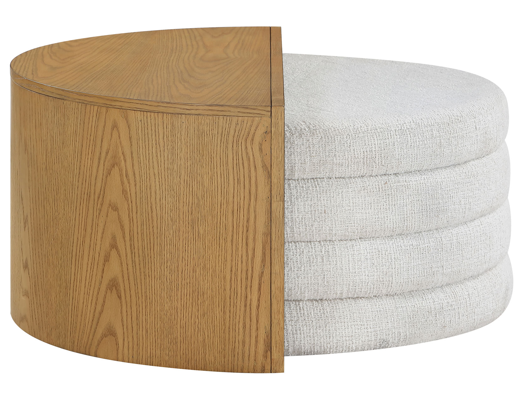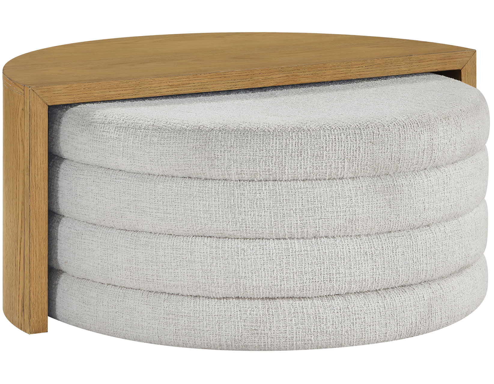 - The ottoman, upholstered in 100% polyester cross-hatch boucle fabric in an eggshell hue, offers a durable, easy-to-clean surface that resists everyday stains and spills.