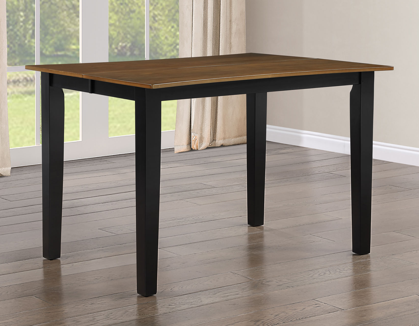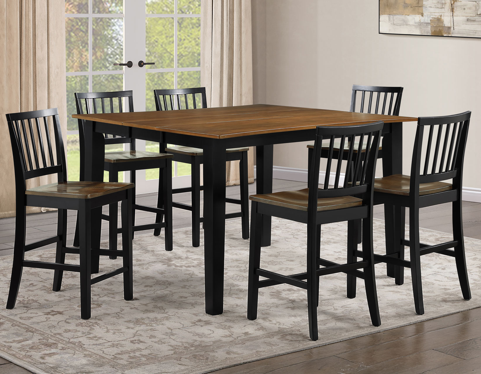 The Joplin 5-Piece Counter Height Dining Set blends timeless farmhouse charm with modern functionality. The 36-inch high counter table features a rich walnut veneer top, ebony-finished solid wood legs, and stylish concave edges for added visual appeal. A 12-inch leaf extends the table from 42 to 54 inches, comfortably seating up to eight. Paired with four schoolhouse-inspired counter stools, each crafted with solid wood and finished in coordinating walnut and ebony tones, the set delivers comfort through scooped seats and durability through reinforced construction—perfect for today’s casual dining spaces.