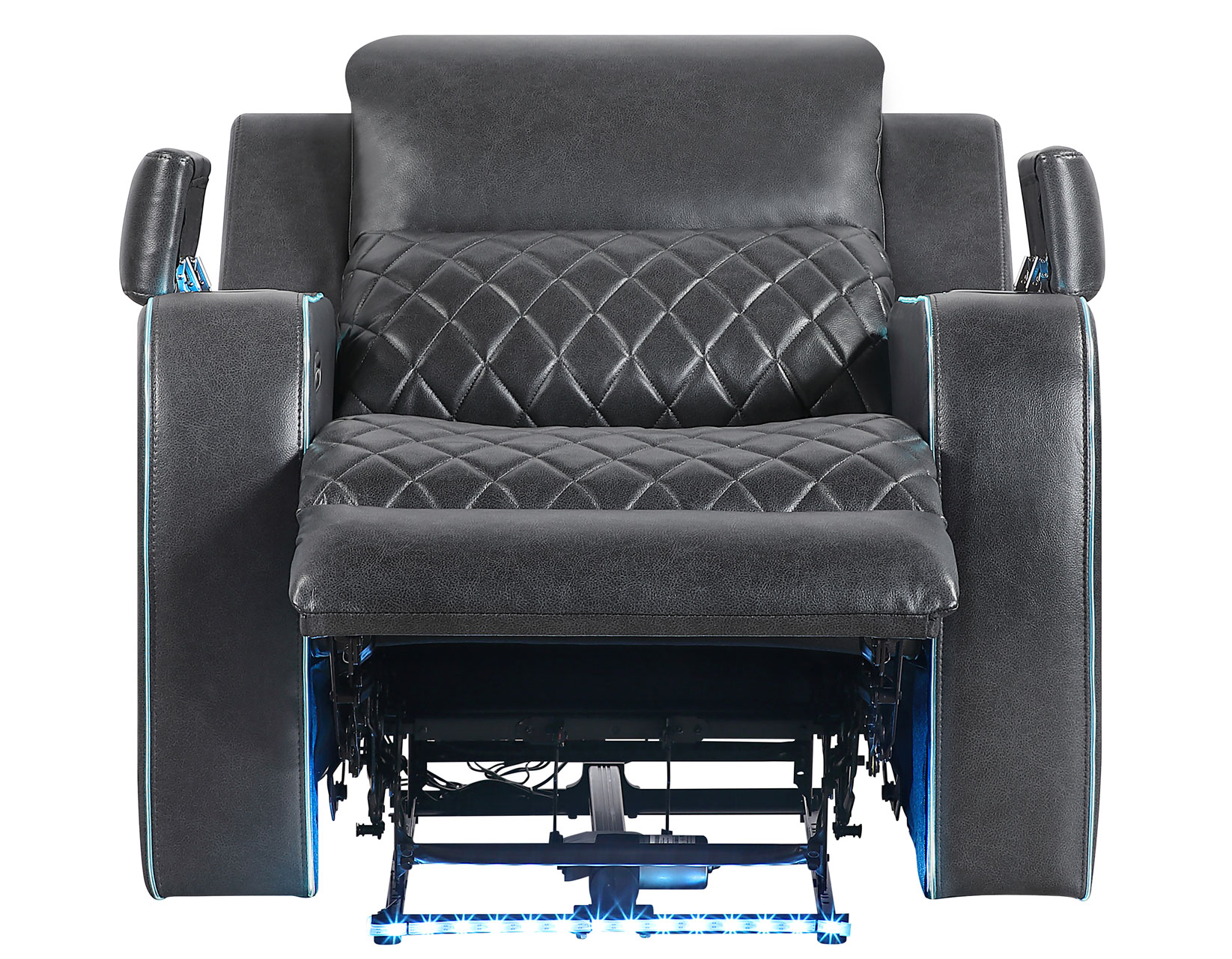 Transform your living room into a personal theater with the Luna Charcoal Power-Reclining 3-Piece Set, upholstered in smooth charcoal-gray vegan leather with elegant argyle quilting on seats, backs, and sides. Built-in speakers provide immersive, room-filling sound, while illuminated cupholders and subtle under-frame lighting create the perfect cinematic atmosphere. The collection includes a spacious sofa with drop-down console, a console loveseat, and a matching recliner—all with effortless power recline for customized comfort. Stylish and high-tech, Luna Charcoal brings luxury and entertainment together beautifully.