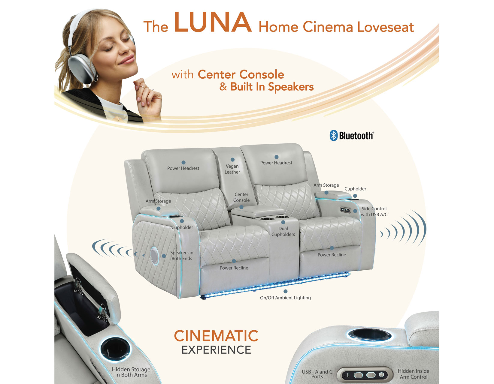 Relax in modern style with the Luna Ice, upholstered in smooth, icy-gray vegan leather featuring an elegant argyle-quilted pattern on the seats, backs, and sides for a refined, high-end look. Effortless power recline lets you adjust the back and footrest to your perfect position, while built-in speakers create immersive sound. A sleek center console offers wireless charging, USB-A & C ports, ambient lighting, and convenient storage—bringing sophisticated design and smart entertainment to your living space for the ultimate at-home theater experience.