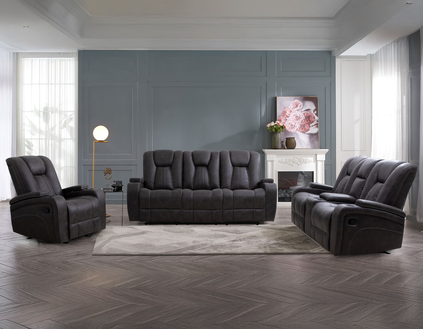 - 3-Piece Ensemble: 3-Piece Set includes the Marlow Charcoal Manual Reclining Sofa, Marlow Charcoal Manual Reclining Console Loveseat and Marlow Charcoal Manual Recliner. Each item also sold separately.