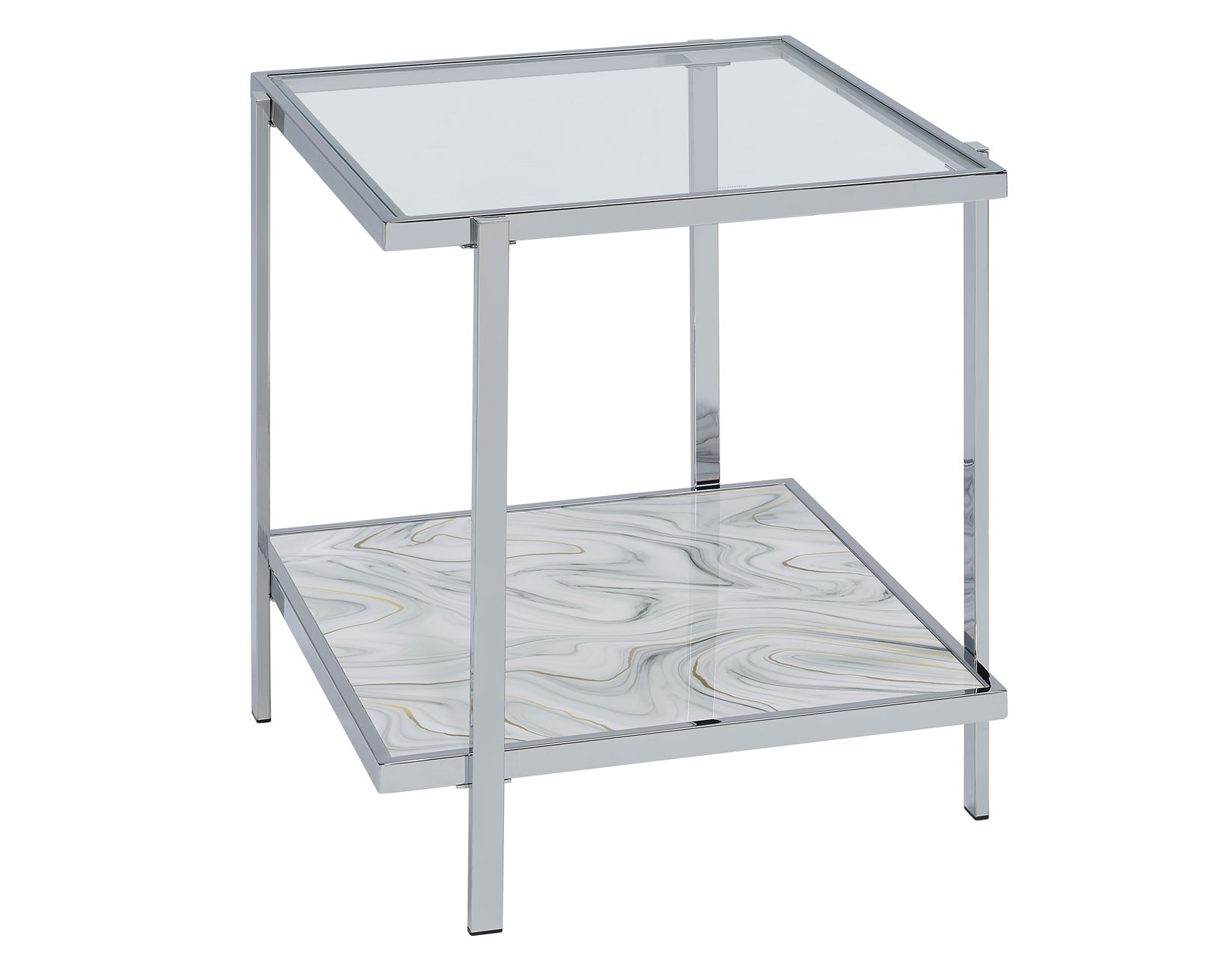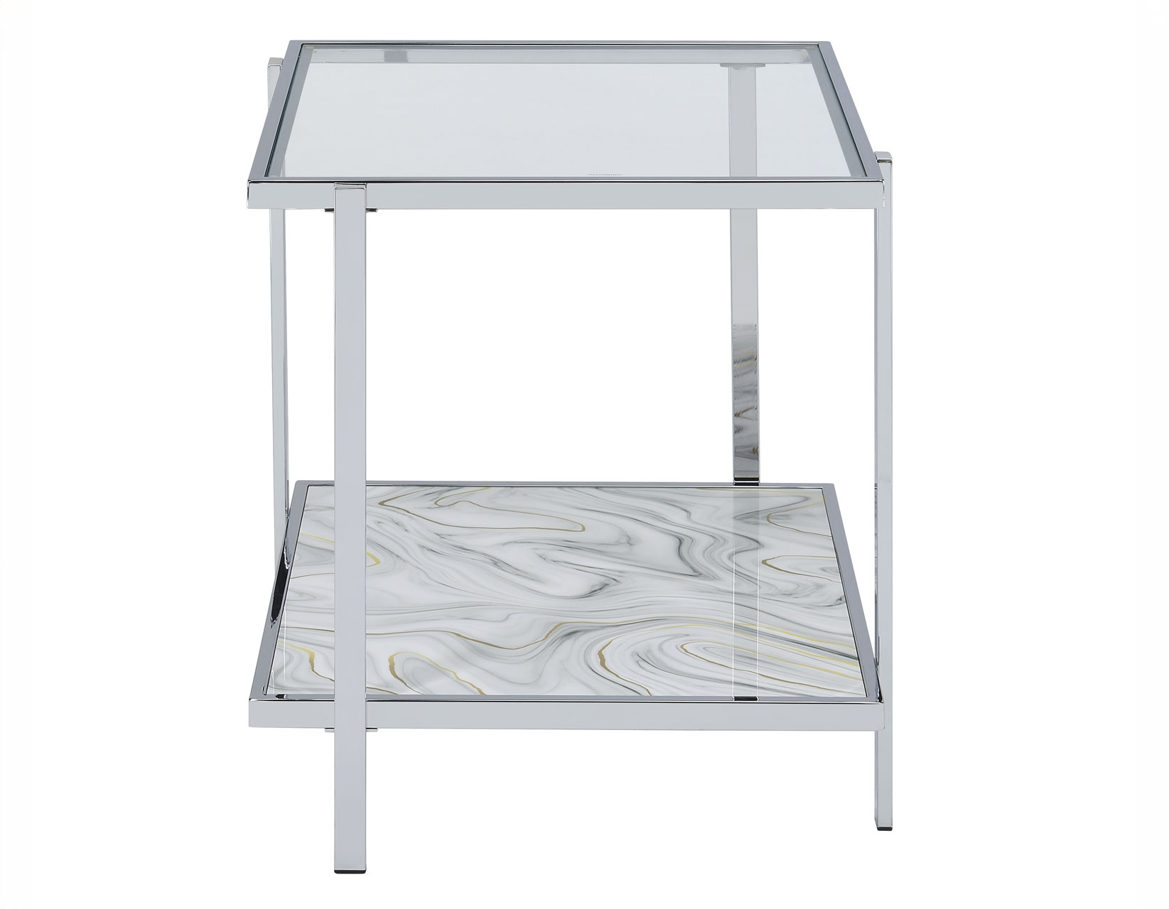 The Mika 3-piece table group sets up your entire living room in one stylish step. Featuring a coffee table and two end tables, this set provides all the essential accents for your space. The stylized swirling faux-stone pattern at the heart of the group brings together a room’s colors beautifully. Tempered glass tops and a chrome frame add a striking touch, while the generous bottom shelf offers ample storage or display space.