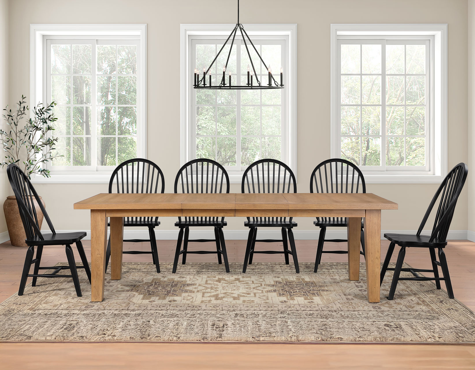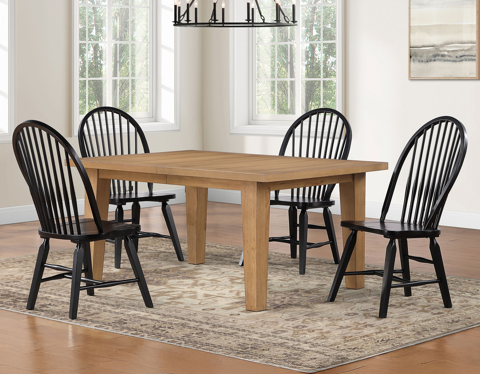 Beautifully designed for modern living while capturing the character and style of one-of-a-kind antiques, Sommerset blends the rustic charm of yesteryear with today’s conveniences. Anchored by the 64–96″ oak dining table with a time-worn antique look, the table comfortably seats up to eight using two 16″ leaves that extend it to a full 96 inches. When not in use, the leaves conveniently store beneath the tabletop, eliminating the need for extra storage space in your home. Paired with black solid wood modern Windsor chairs, the collection creates a cohesive yet slightly eclectic look that is both timeless and stunning.