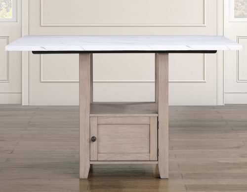 The 5-Piece Taylor Faux-Marble Counter Dining Set offers a stylish blend of comfort and practicality. The 36-inch faux-marble table delivers the elegant look of real marble at a more affordable price, with a tan wood finish that brightens any space. Hidden storage and an open shelf add functionality. Four 24-inch counter-height chairs feature gray upholstered cushions for comfort, solid wood legs for durability, and built-in footrests for support. With clean lines and transitional styling, Taylor complements both classic and contemporary spaces with ease.