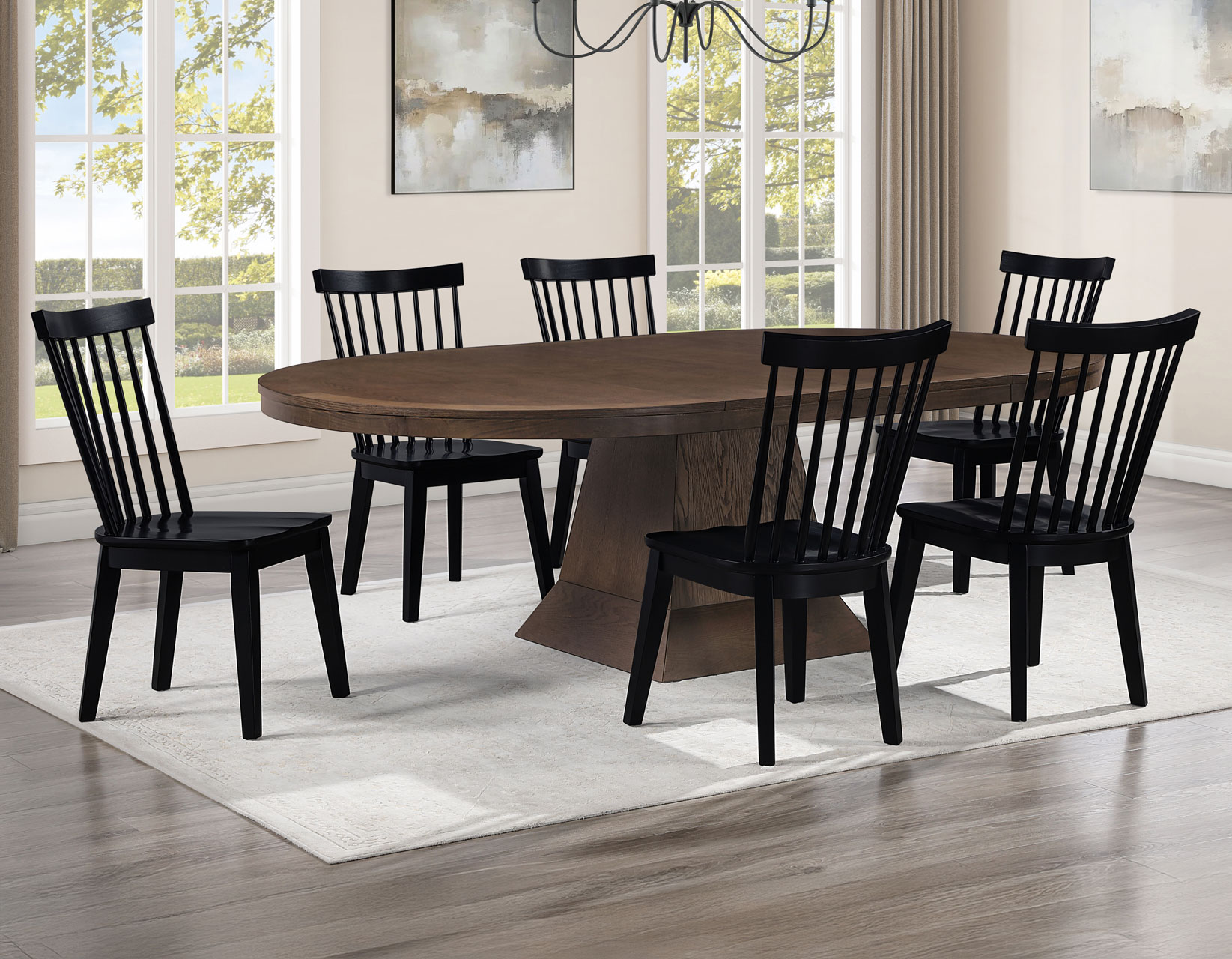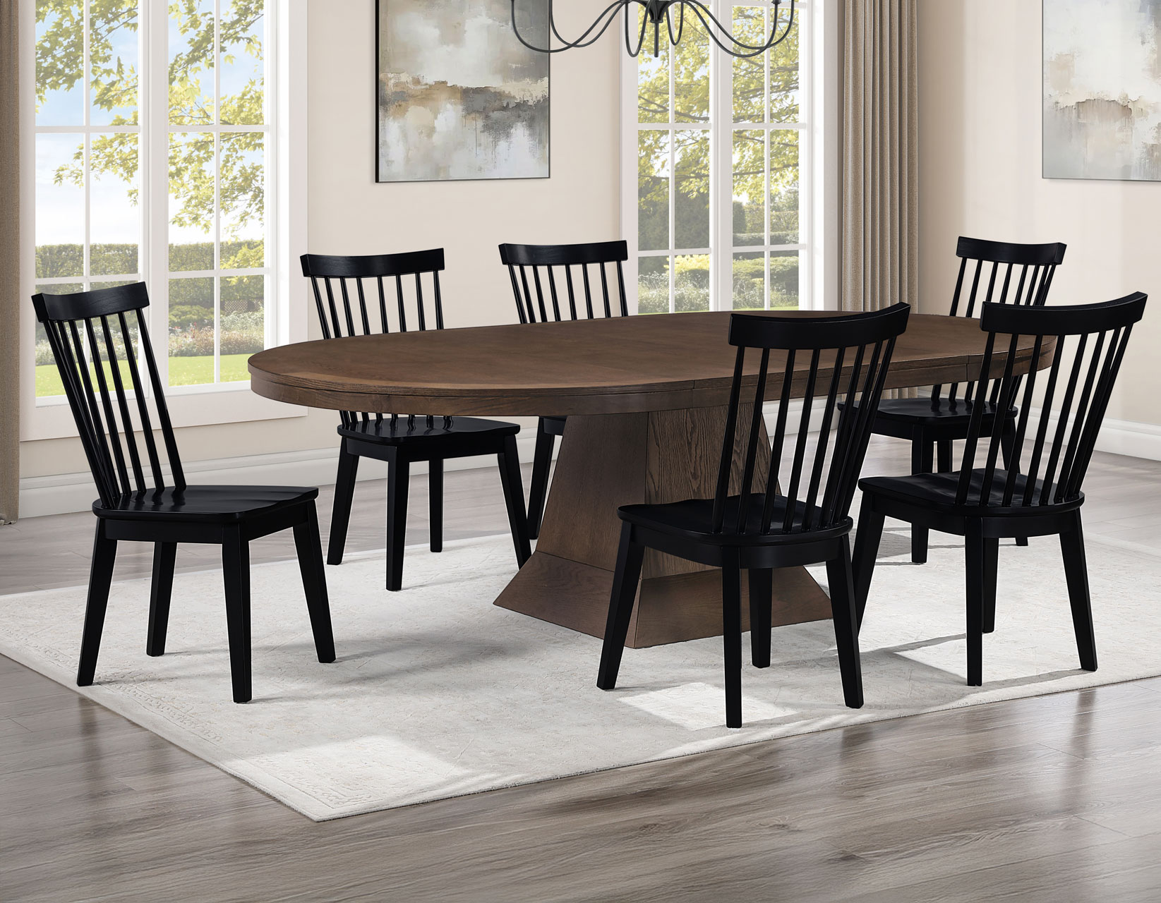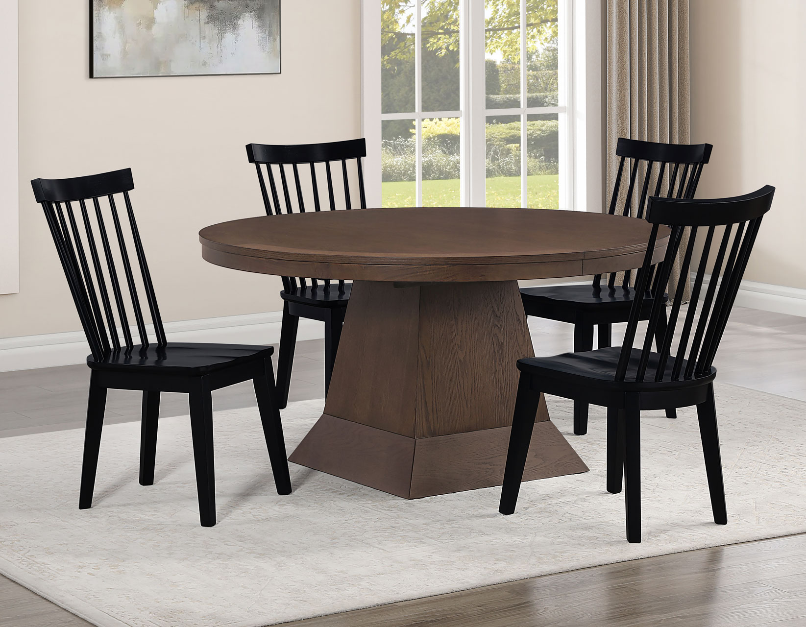 The Vaughn 5-Piece Dining Set combines timeless craftsmanship with modern style for a dining experience that’s both elegant and inviting. The grand 60–96″ Dining Table, finished in warm Coffee, features a bold pedestal base and smooth-gliding leaves that expand effortlessly to seat up to ten. Four Vaughn Black Modern Windsor Side Chairs add contrast and sophistication, with contoured seats, slender slats, and sturdy wood construction for lasting comfort. Together, they create a striking centerpiece for any dining space.